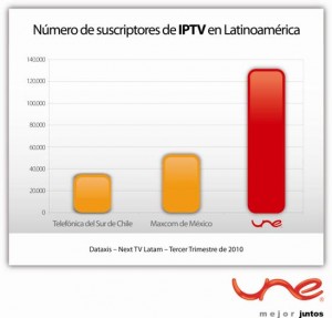 La firma internacional de análisis de mercados, Dataxis, estimó que el principal operador de IPTV en Latinoamérica es UNE EPM Telecomunicaciones, seguido de Maxcom de México y Telefónica del Sur de Chile.