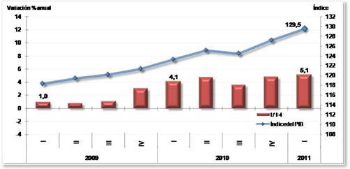 Según el Departamento Administrativo Nacional de Estadísticas, DANE, en el primer trimestre del año 2011 la economía colombiana creció en 5,1% con relación al mismo trimestre de 2010. Frente al trimestre inmediatamente anterior, el Producto Interno Bruto (PIB) aumentó en 1,9%.