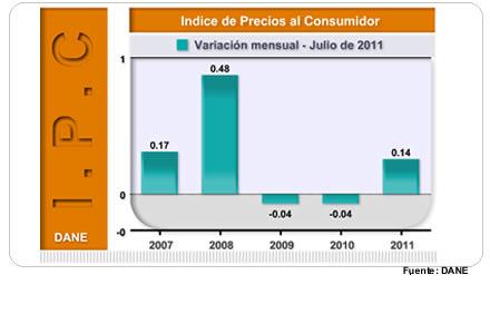 El Departamento Administrativo Nacional de Estadísticas, DANE, reportó que para el mes de julio el Índice de Precios al Consumidor (IPC) registró un incremento de 0,14%, registrando una tasa superior en 0,18 puntos porcentuales a la alcanzada en mismo mes de 2010, cuando reportó -0,04%.