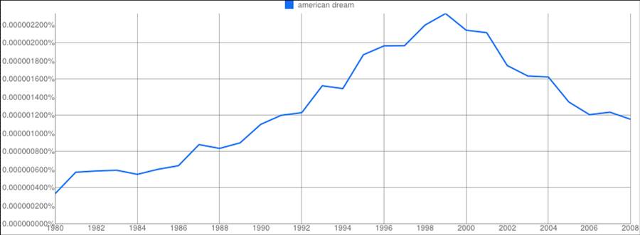 En años en los que las economías latinoamericanas crecen más que la estadounidense, el asunto del sueño americano parece haber pasado de moda. De hecho, la expresión “american dream” pasó de representar el 0,0000022% de los bigrams presentes en los libros de Google escritos en español para 1999, a menos del 0,0000012% en 2008. Es decir, cada vez se hace menos referencia al concepto del sueño americano en la literatura hispana.