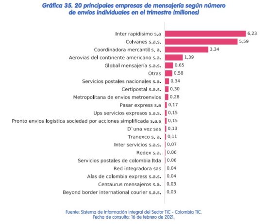 El ministerio realizó el listado de las principales empresas de mensajería según número de envíos individuales durante el cuarto trimestre del 2020, donde Inter rapidísimo lidera el listado con una participación en el mercado del 31,54%, con 6.227.788 envíos y se constituyó como el operador postal de mensajería con mayor número de envíos individuales entre los operadores inscritos en el Registro Postal del Ministerio TIC.