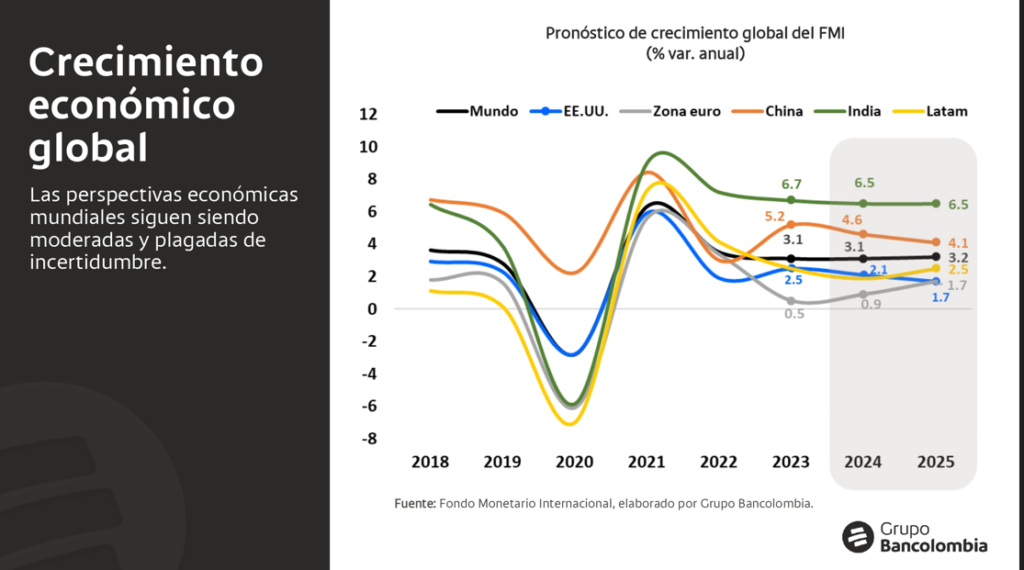 Para Colombia, el Grupo Bancolombia proyecta un crecimiento del PIB de 3.2% en 2024, impulsado por el consumo privado, la inversión y las exportaciones. Sin embargo, advierte que existen riesgos asociados a la situación fiscal, la inflación, el tipo de cambio y la confianza de los agentes económicos.