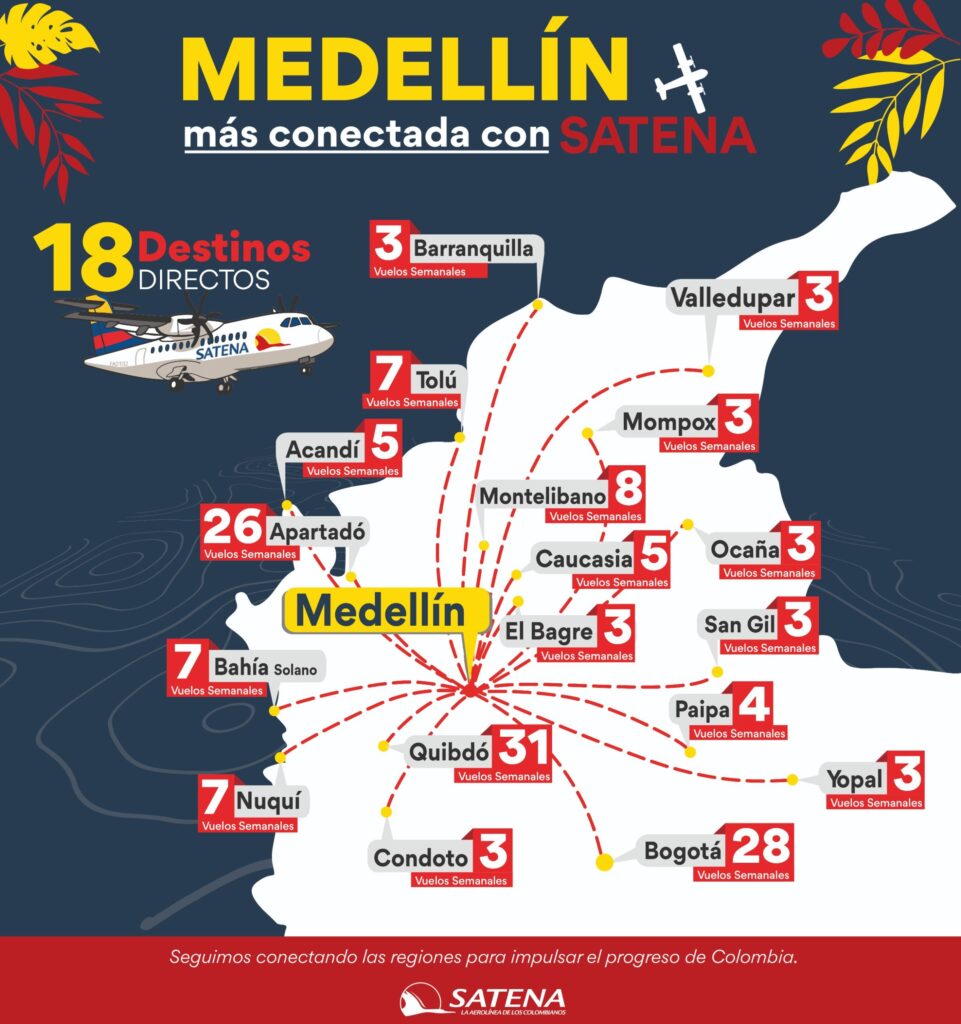La base de Medellín se ha fortalecido para atender regiones en el Pacífico, Caribe, Orinoquía y el nororiente colombiano. Para empezar, el Mayor General Óscar Zuluaga Castaño, presidente de SATENA, destacó que esta base permite integrar comunidades que históricamente han tenido limitada infraestructura. Posteriormente, la operación se ha diversificado hacia rutas estratégicas: